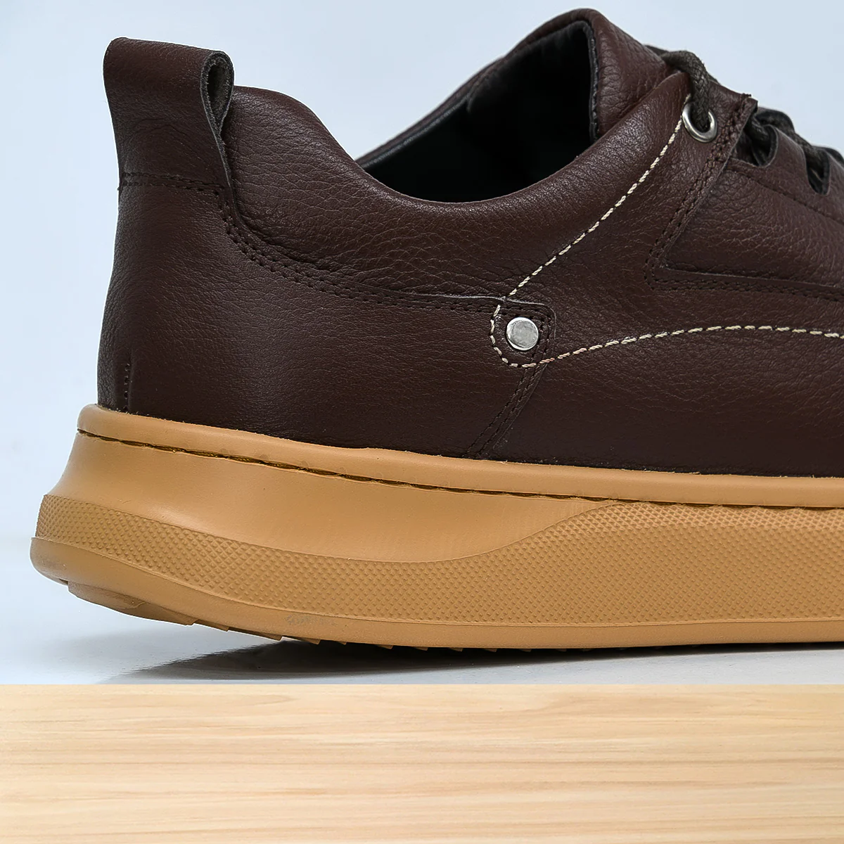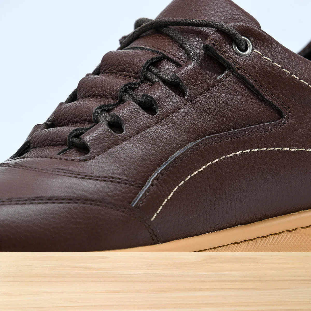 Basket Hoka pour homme en cuir marron, ultra-légère et dotée d’une couture latérale robuste.