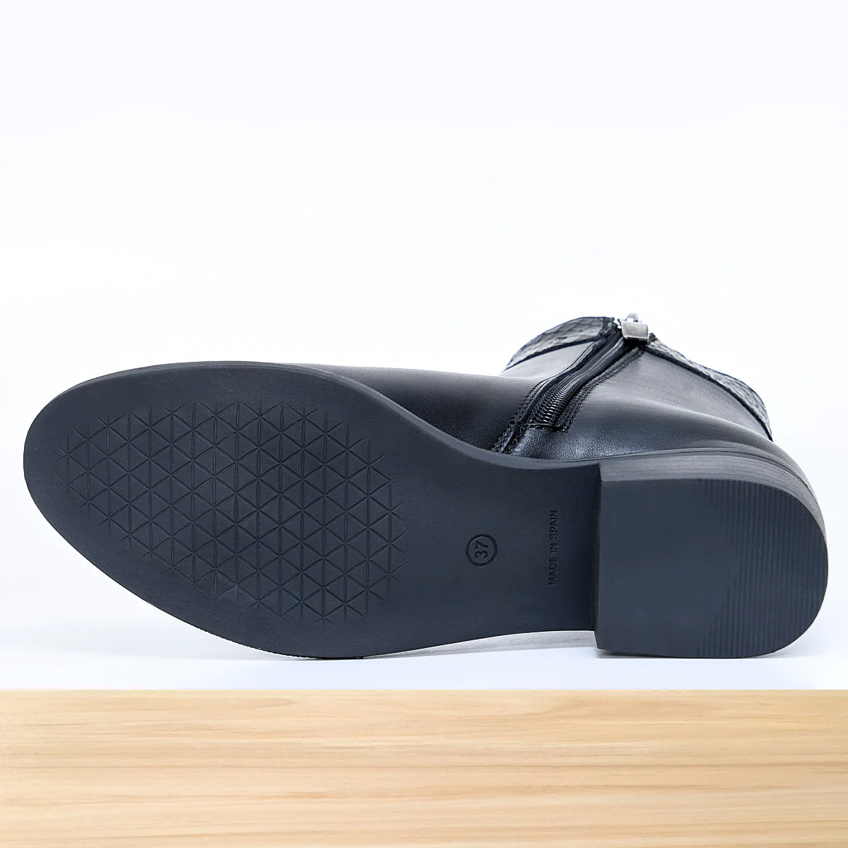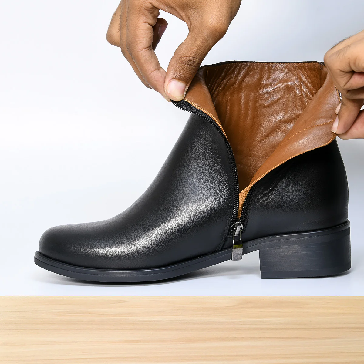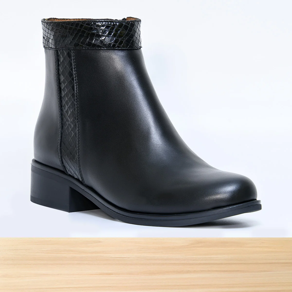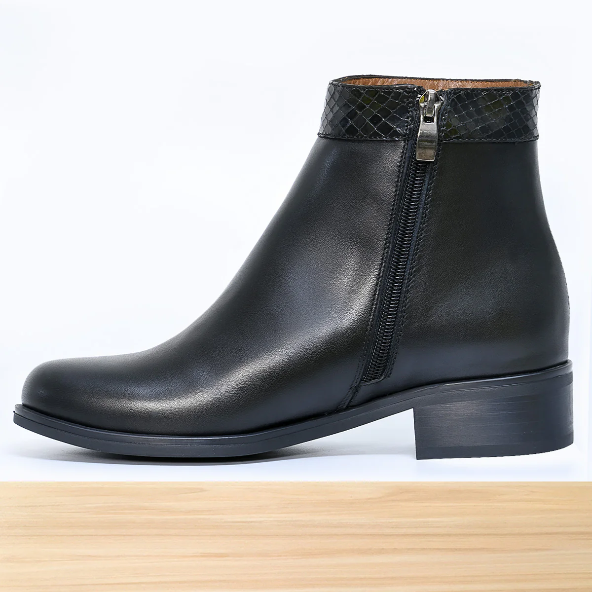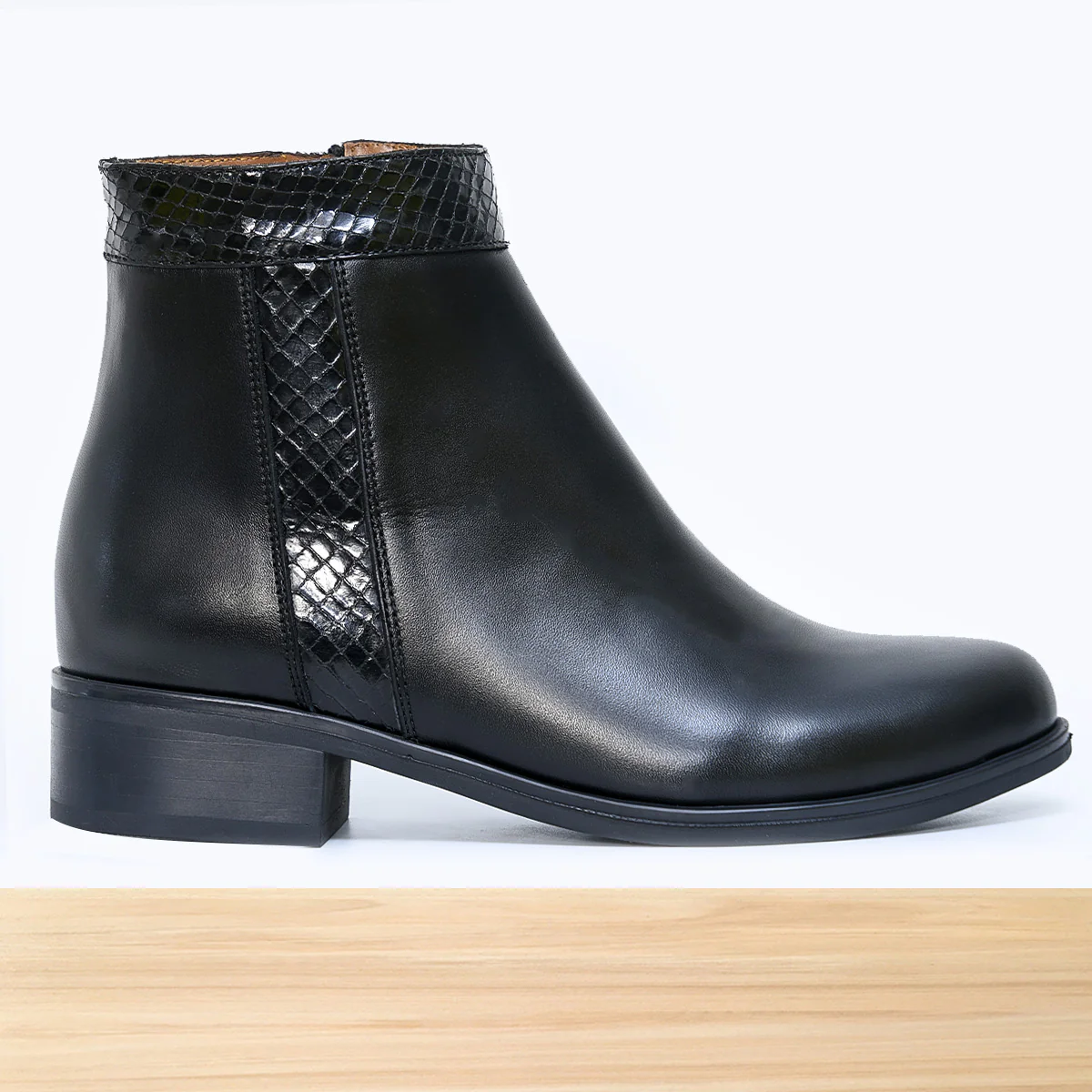 Bottine femme Orlea noire, chaussure montante élégante au design moderne et raffiné, avec fermeture zip latérale et finitions soignées pour un style tendance. Cuir de qualité aux détails travaillés, semelle confortable, parfaite pour un look chic automne-hiver au quotidien. Fabrication artisanale réalisée au Maroc par des professionnels qualifiés.