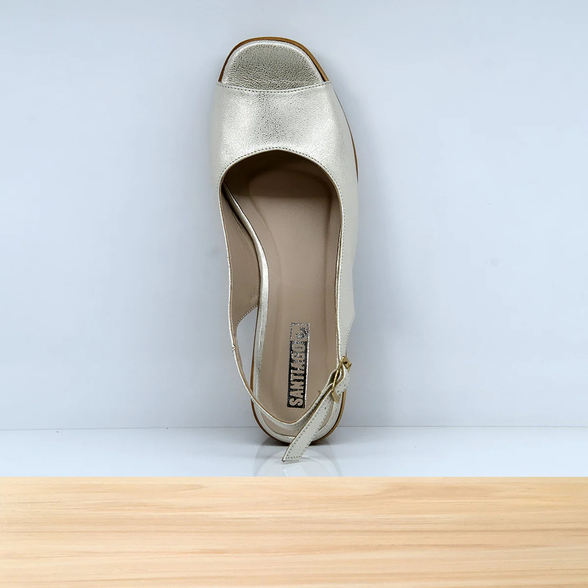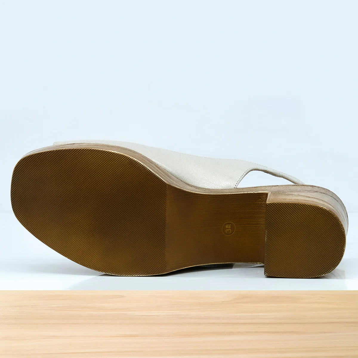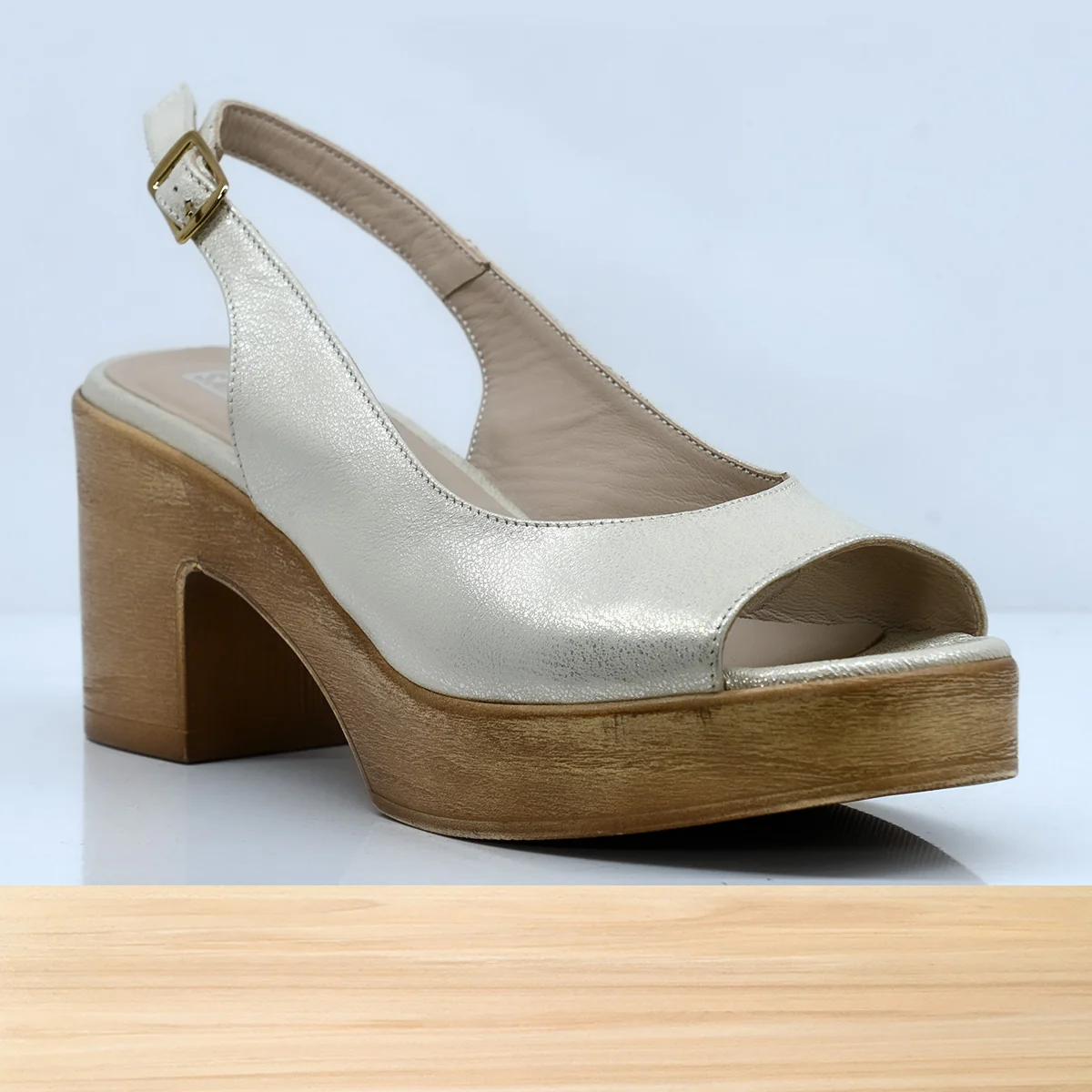 Élégante et confortable, la sandale Arika est faite en cuir argenté brillant avec un talon effet bois.
